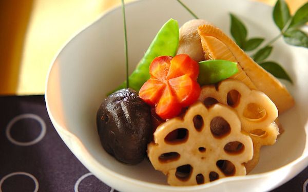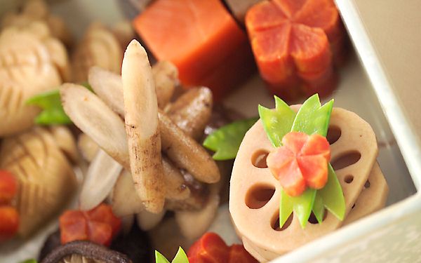 レンコン、シイタケ、ゴボウ、ニンジン、タケノコ、コンニャクを使う煮しめです。亀の形に飾り切りされた水煮タケノコを購入し、金時ニンジンを飾り切りにするだけでも華やかさがアップします。金時ニンジンは火が通りやすいので、煮過ぎないように注意してくださいね。