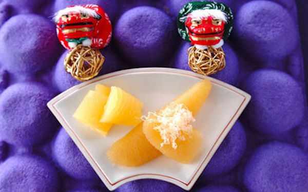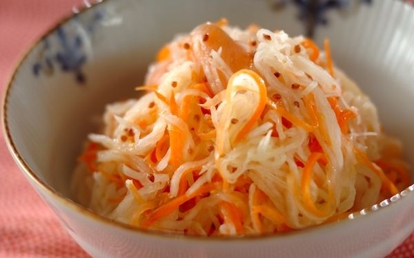 ユズの香りが効いた紅白なますと、スモークサーモンを組み合わせるユニークな一品です。隠し味は粒マスタード。全体の味を引き締め、まろやかさをプラスできます。すべての材料をを混ぜ合わせ、15分以上漬けた後に召し上がれ! パンにはさんで食べても美味しいです。