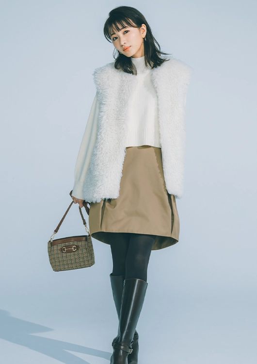 ミニスカート¥55,000/ボーダーズ アット バルコニー ジレ¥22,000/マイストラーダ ニット¥8,250/リリアン カラット イヤリング¥3,080/アネモネ(サンポークリエイト) バッグ¥5,940/カシュカシュ(アンビリオン) ロングブーツ¥41,800/ダイアナ(ダイアナ 銀座本店) タイツ¥880/アツギ ザ・レッグバー(アツギ)