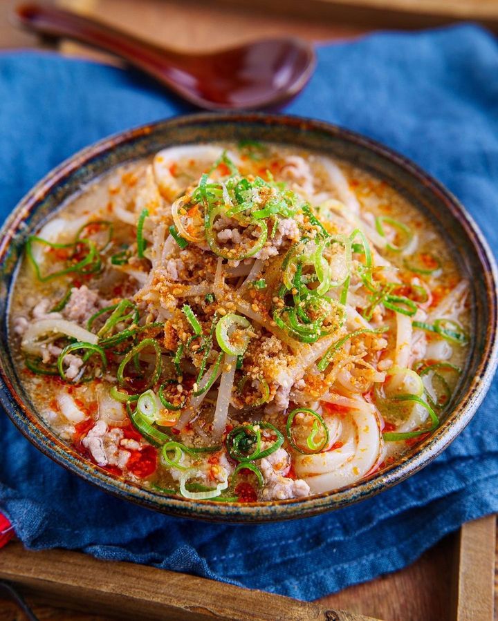 レシピによっては「練りごま」が必要ですが、おうちにないことも多いですよね。こちらの「豚ひき肉ともやしのピリ辛担々うどん」は練りごまなしで作れて、とっても濃厚な味わいなんです。