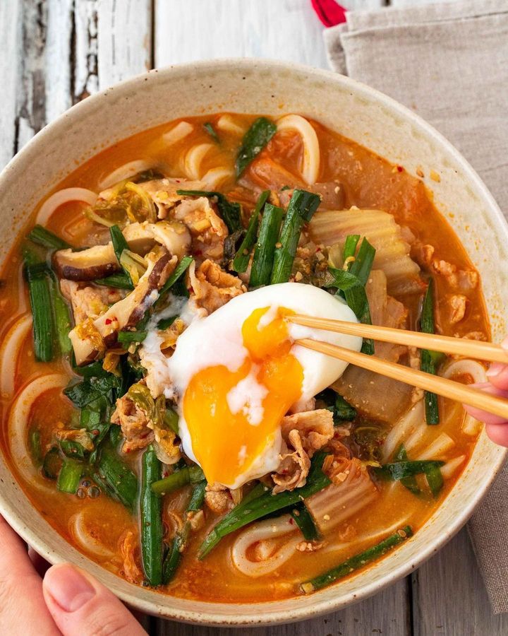 仕上げに温泉卵をトッピングして崩しながら食べれば、キムチや豚バラ肉の旨みと卵黄が絡み合ってたまらないおいしさです。
