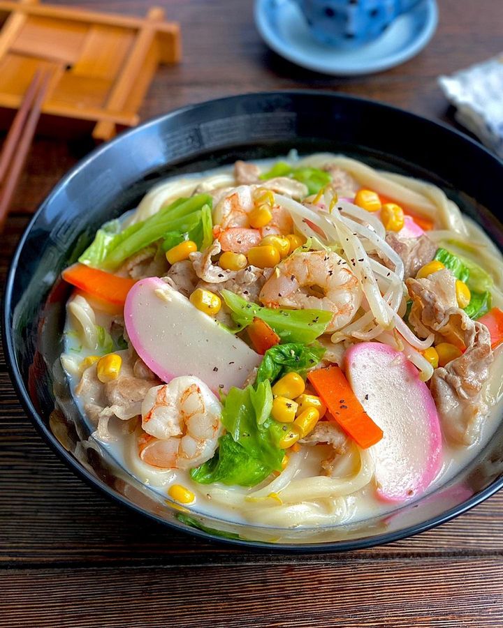牛乳や鶏ガラスープ、オイスターソースなどを使って作るちゃんぽん風スープは、濃厚でコク旨。うどんとの相性もぴったりですよ。