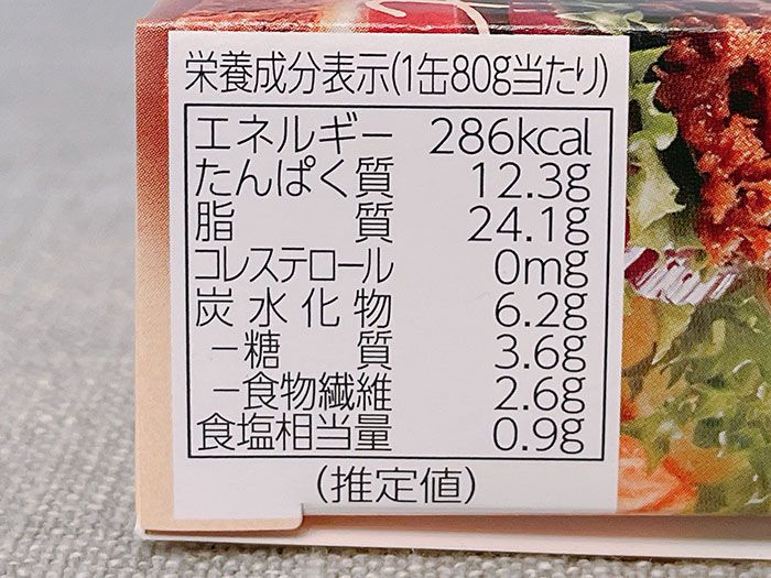 1缶(80g当たり)286kcal、たんぱく質 12.3g、脂質 24.1g、炭水化物 6.2g、食塩相当量 0.9g