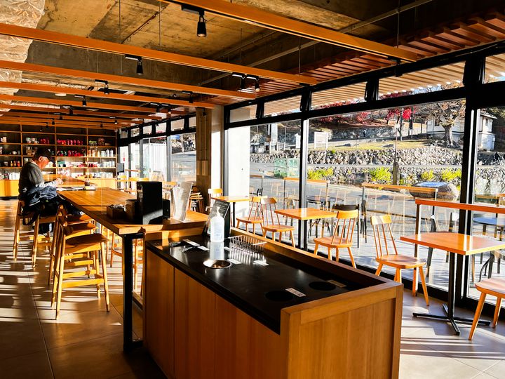 店内に入ると、日差しが燦々と差し込む、広々とした空間が広がります。中央には吉野杉の長テーブルが置いてあって、とても奈良っぽい!