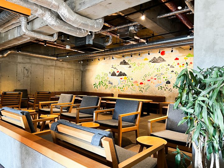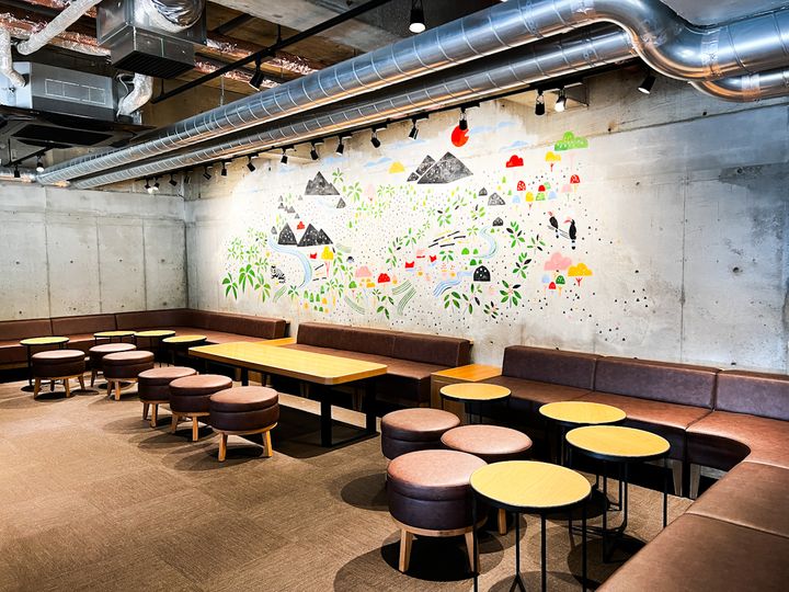 お店の奥には小上がりがあり、壁画が描かれたソファスペースが設置されています。テラス側のスペースは割と混んでいるので、ゆっくりと過ごしたいときは、小上がりスペースおすすめです。