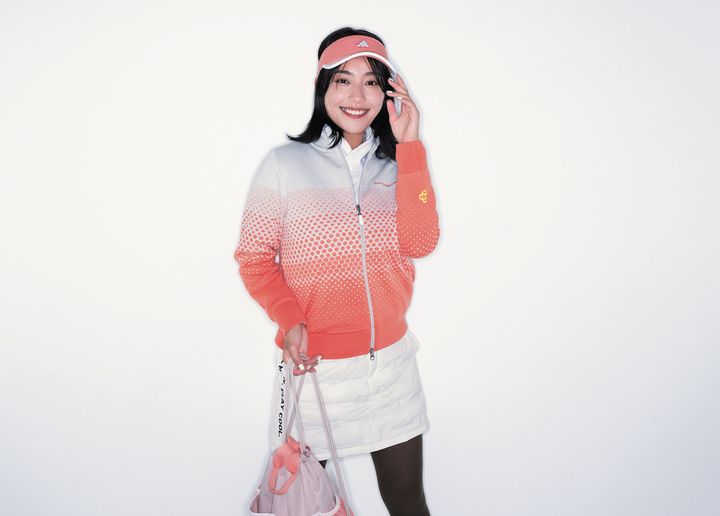 ブルゾン¥26,400(ジュン アンド ロペ) 中に着たモックネックシャツ¥15,400(ロサーセン/グリップインターナショナル) スカート¥30,800(ピンアパレル/ピンアパレルお客様相談室) サンバイザー¥3,300、バッグ¥3,300〈参考価格〉(共にアディダスゴルフ/アディダス ジャパン) タイツ/スタイリスト私物