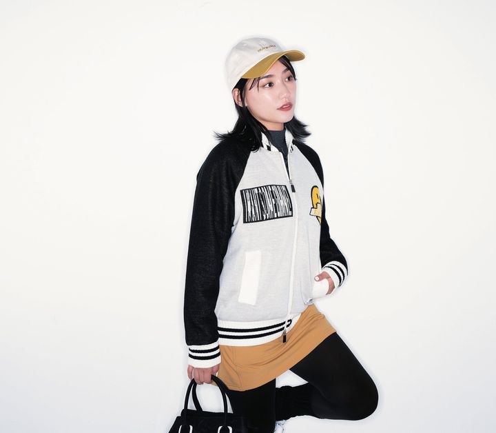 ブルゾン¥52,800(ホーンガーメント/キューブ) 中に着たモックネックシャツ¥12,100(アディダスゴルフ/アディダス ジャパン) スカート¥14,850(オークリー/ルックスオティカジャパン カスタマーサービス) キャップ¥6,600 (ビームス ゴルフ/ビームス ゴルフ 有楽町) バッグ¥17,600(ランバンスポール/デサントジャパン) ソックス¥2,750(ジャックバニー!!) シューズ¥42,900 (マーク & ロナ/マーク & ロナ表参道ヒルズ店) タイツ/スタイリスト私物