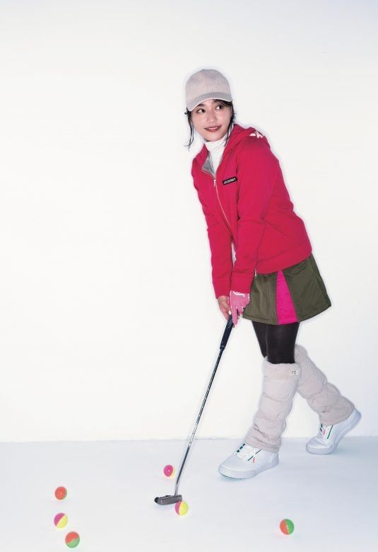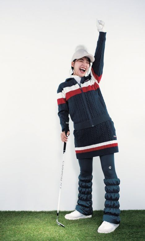 パーカ¥27,500、スカート¥17,600、グローブ〈片手〉¥2,970(以上ジャックバニー!!) 中に着たモックネックシャツ¥17,600(デサントゴルフ/デサントジャパン) キャップ¥4,730(ルコックスポルティフ/デサントジャパン) レッグウォーマー¥9,350(ビバハート/グリップインターナショナル) シューズ¥13,200〈編集部調べ〉(アディダスゴルフ/アディダス ジャパン) タイツ/スタイリスト私物