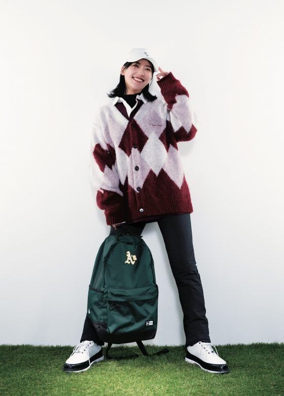 カーディガン¥14,300、ポロシャツ¥9,900、リュック¥9,350(以上ニューエラ) 中に着たモックネックシャツ¥12,100(ピンアパレル/ピンアパレルお客様相談室) キャップ¥6,600(ルコックスポルティフ/デサントジャパン) パンツ¥27,500、シューズ¥29,700〈編集部調べ〉(共にアディダスゴルフ/アディダス ジャパン)