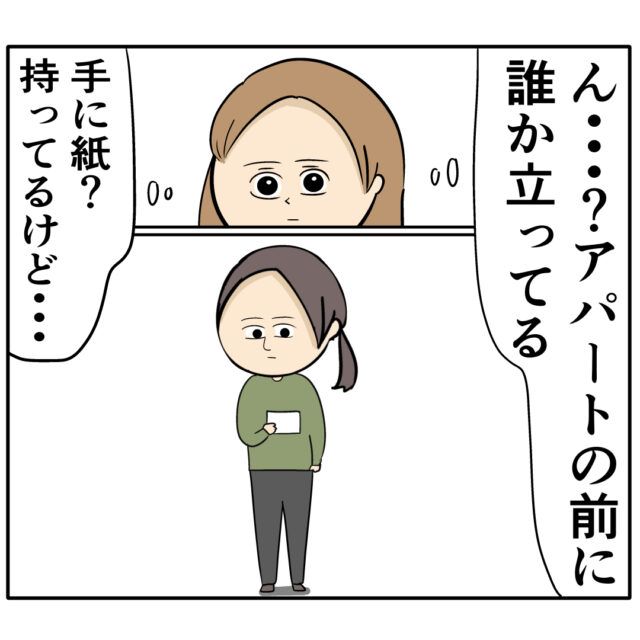 「ん・・?アパートの前に誰か立ってる。手に紙?持ってるけど・・」