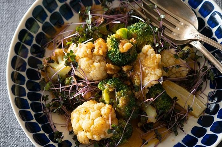カリフラワーとブロッコリーのほっくりとした味わいに、ソースの優しい甘味とスパイス感、カリカリのくるみもよく合います。仕上げに散らしたスプラウトのピリッとした香味がアクセント。