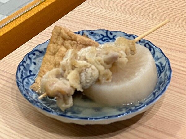1本ずつ注文できます。お出汁がシッカリとしみて、柔らかくなった具材、湯けむりの向こうにはお酒、最高のシチュエーションですね!