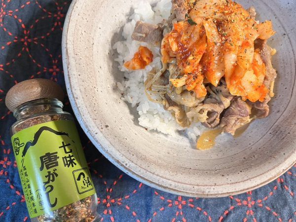 まずは牛丼のキムチのせに、「追い七味とうがらし」してみました!