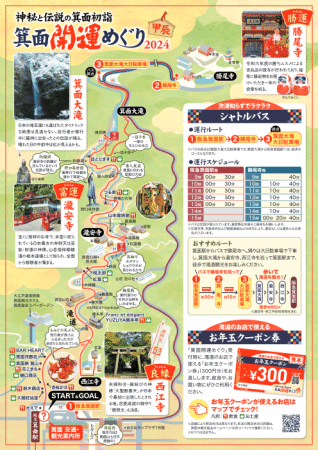 年の初めに「富運の瀧安寺」「良縁の西江寺」「勝運の勝尾寺」を巡ると、“最大のパワーを得ることができる”といわれている箕面の3カ寺。同イベントでは、阪急箕面駅からイベントバスに乗車し、勝尾寺を経由、箕面大滝(大日駐車場)まで移動。その後、滝道を歩きながら瀧安寺、西江寺を巡ります。参加者には、鳥瞰図作家の延木由起子さんが描いた「箕面山御朱印絵図」を進呈。絵図を完成させ、箕面 交通・観光案内所で提示すると開運土産がもらえます。さらに、滝道沿道の店舗で使えるお年玉クーポン券(300円分)もついてくるので、滝道観光も楽しめます。