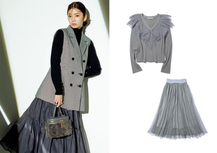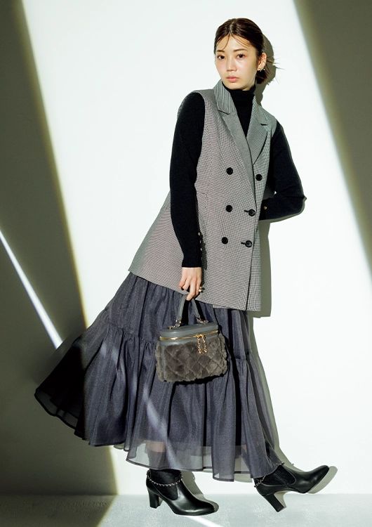 チュールスカート¥20,900、ジレ¥26,400/ともにアルページュストーリー ニット¥5,390/31Sons de mode(ヒロタ) イヤリング¥3,080/アネモネ(サンポクリエイト) リング¥4,950/ポピー・ケー(ロードス) バッグ¥15,400、ショートブーツ¥31,350/ともにダイアナ(ダイアナ 銀座本店)