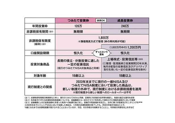 現NISAでは、一般NISA(新NISAの成長投資枠)とつみたてNISA(新NISAのつみたて投資枠)の口座を同時に持つことはできませんが、新NISAでは併用が可能。また、現NISAにある期間は撤廃され、ずっと非課税で投資できるように。投資額の上限も上がり、より利用しやすくなります。
