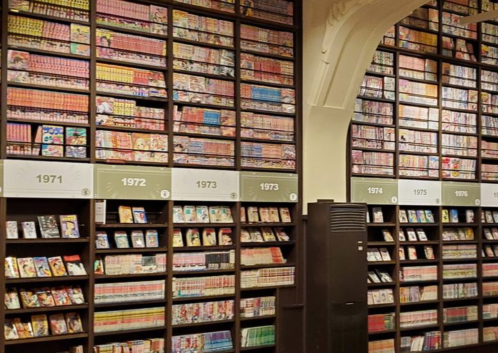 各階廊下の書架や、大きなお部屋の壁一面に埋め尽くされたマンガの壁には、1970年代以降のマンガ単行本が約5万冊も設置されているそうです。各フロアには検索機があるので読んでみたかったマンガを簡単に探すことができます。