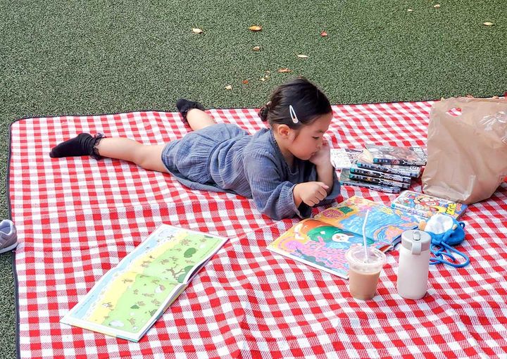 というようにマンガを片手にピクニック気分を楽しめるのです! 芝生でごろごろのんびりしながら、子どもは絵本を読んだり芝生ではしゃげたり、わたしはマンガを読み放題なんて最高です。