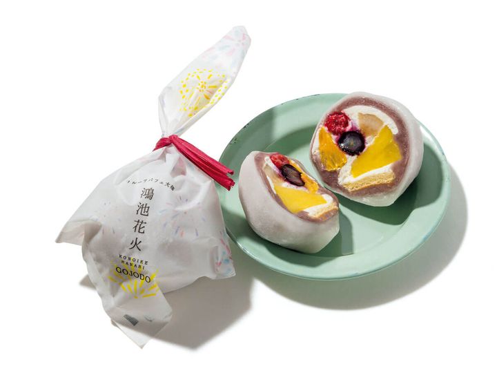 「和菓子と楽しいことをつなげていきたい」と作られたフルーツ大福が表現するのは、大阪・鴻池の夜空に輝く、彩り鮮やかな花火。ブルーベリー、オレンジ、ラズベリー、バナナ、パイナップルの5種類のフレッシュフルーツと生クリーム、こしあんを、滋賀県産の羽二重もちで包んだ逸品です。冷凍発送もできるので、遠方の方への贈り物にもオススメ♪