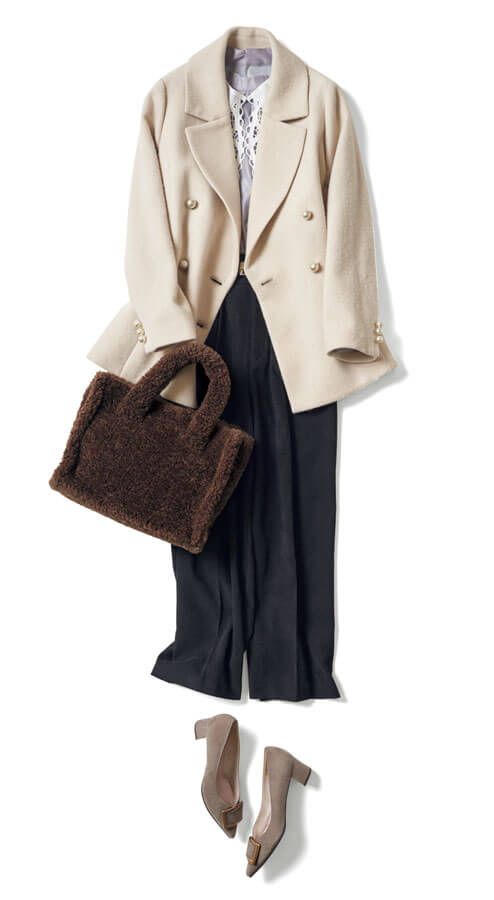 コート¥16,990/クチュール ブローチ ブラウス¥10,890/WILLSELECTION(WILLSE LECTION ルミネエスト新宿店) パンツ¥10,450/31 Sons de mode(ヒロタ) バッグ¥2,990/GU パンプス¥24,200/銀座かねまつ(銀座かねまつ 6丁目本店)