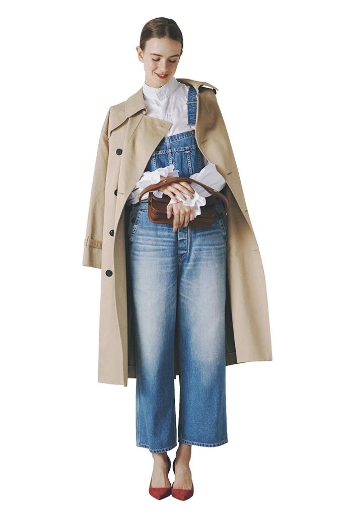 白シャツ 52,800円/ブリエンヌ パリ ディス フォー ロク(ロク シンジュク) トレンチコート 159,500円/ATON(ATON AOYAMA) ブルーデニムサロペット 47,300円/ブリル(エレメントルール カスタマーサービス) バッグ 35,200円/クリスチャン ヴィラ(カレンソロジー 新宿) 赤パンプス 30,800円/TSURU By MARIKO OIKAWA