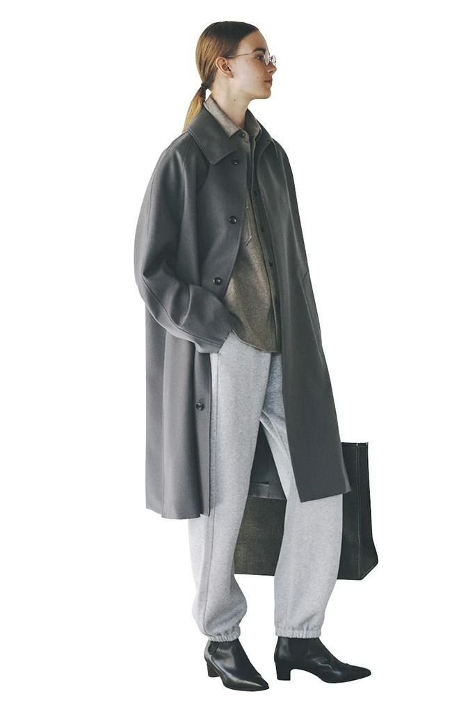 グレーシャツ 38,500円/ロエフ(エイチ ビューティー&ユース) ロングコート 106,150円/THE RERACS × Edition(エディション 表参道ヒルズ店) スエットパンツ 16,500円/THE SHINZONE(Shinzone ルミネ新宿店) 眼鏡 47,300円/アヤメ バッグ 60,500円/ア ヴァケーション(ノーベルバ) ブーツ 85,800円/アディガエタ(デミルクス ビームス 新宿)