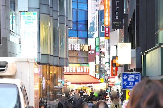 たくさんのお店が並ぶ韓国の明洞(ミョンドン)は、土曜日ということもあってかかなりの人通り! 賑やかなその様子はどことなく日本の渋谷を思わせます。