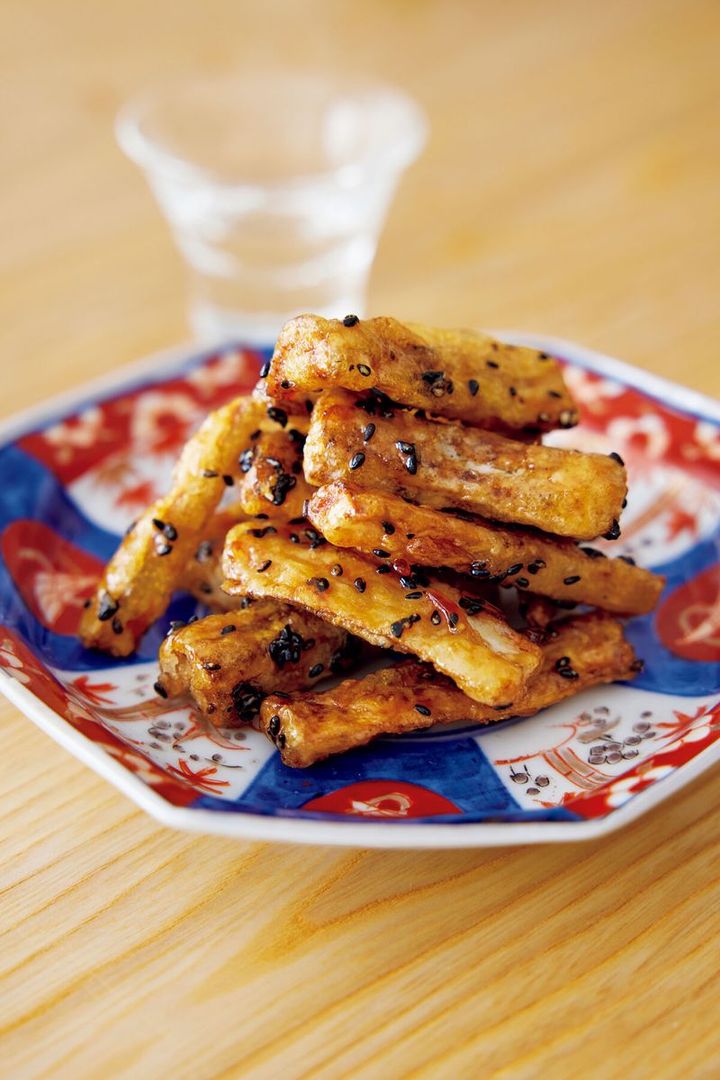 ごぼうは包丁の背で皮をこそげ、めん棒などでたたいて縦半分に割り、長さ6cmほどに切る。水に5分ほどさらして水けをかるくきり、片栗粉適宜を全体にまぶす。