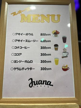 <MENU> アサイーボウル 800円 アサイースムージー 400円 コナコーヒー 300円 ココア 300円 ヨンジーガムロ(楊枝甘露) 300円 クラムチャウダー 300円