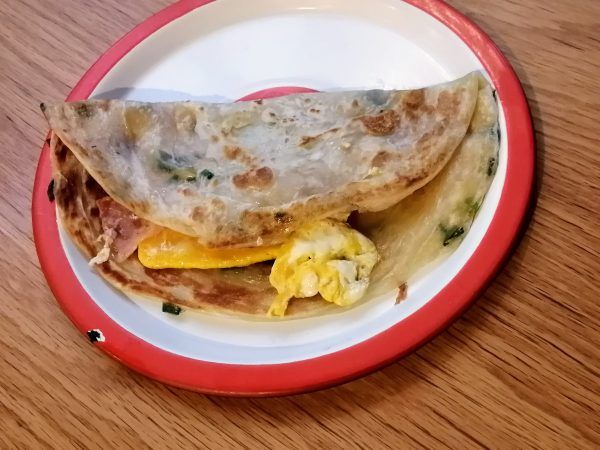 台湾のローカルフード葱抓餅(ツォンジュアビン)。青ネギ、バジル、ほうれん草入りの3種類があります。わが家の子どもたちは、青ネギがお気に入りです。