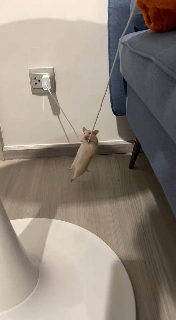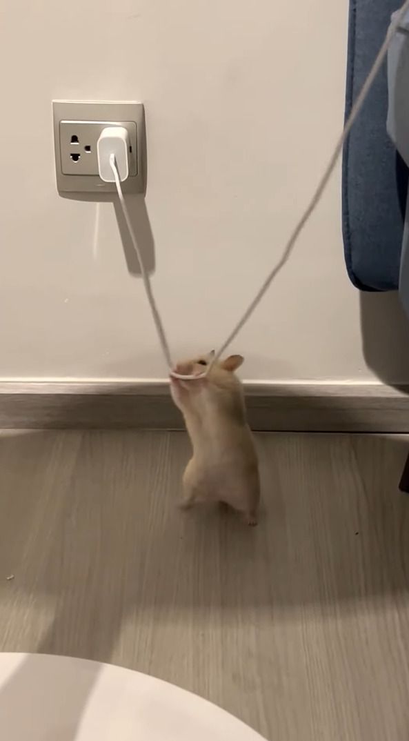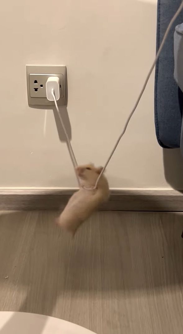 危険だから降りて!ハムスターが充電用ケーブルで綱渡り!?!?【海外・動画】