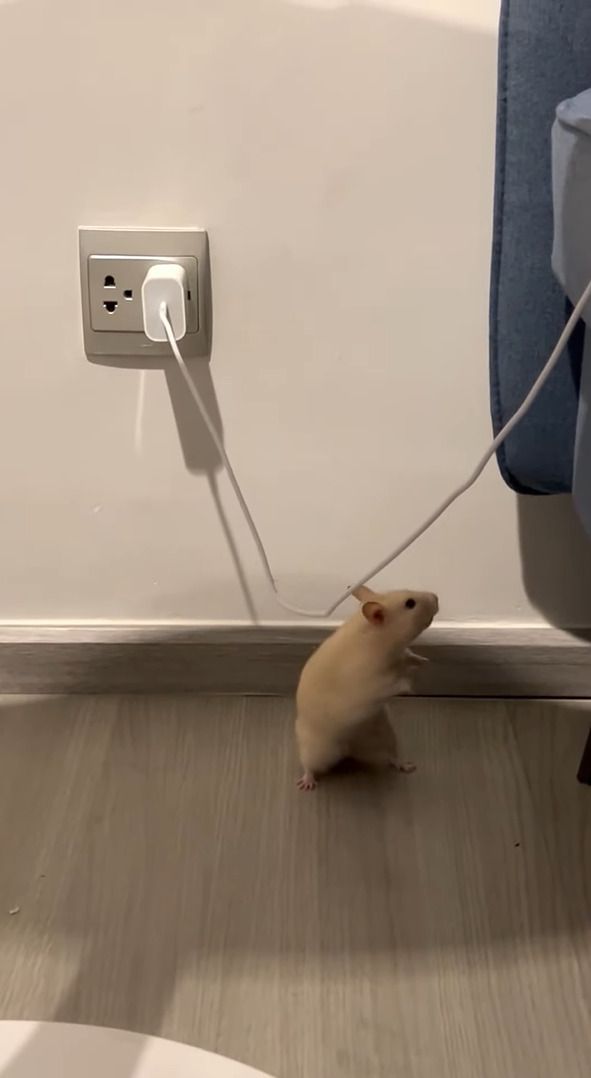 充電器のケーブルにつかまり綱渡りをしていたハムスター。 その時の様子は、こちらの動画からご覧いただけます。