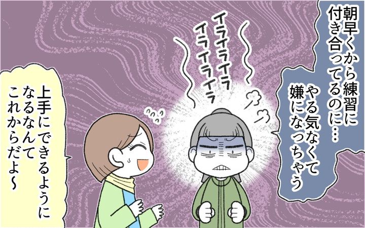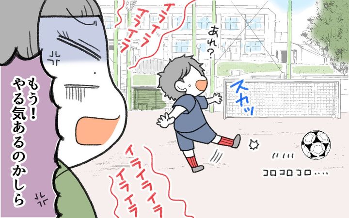 息子のサッカーチームで見学していると…。ゆうじくんママの明美が、イライラしています。朝から練習に付き合っているのに、ミスはするやるし、やるき気のない動きにとうとう…。