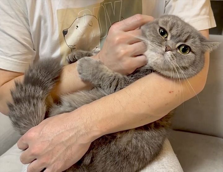 ご紹介するのは、亀ぽま(@himaritomugi)がX(旧Twitter)に投稿された写真。 愛猫のマンチカン『ひまり』ちゃんを抱っこした時の様子です。