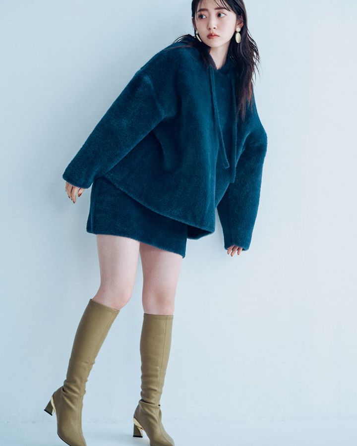 ネイビーフェザーニットパーカとスカートのセット 17,600円/COCO DEAL(ココ ディール) イヤリング 7,560円/アビステ ロングブーツ 16,900円/チャールズ&キース(チャールズ&キース ジャパン)