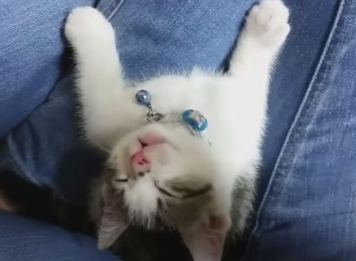 2. 可愛すぎて、動けない〜! 膝の上で子猫がこっちを見つめながらウトウト。