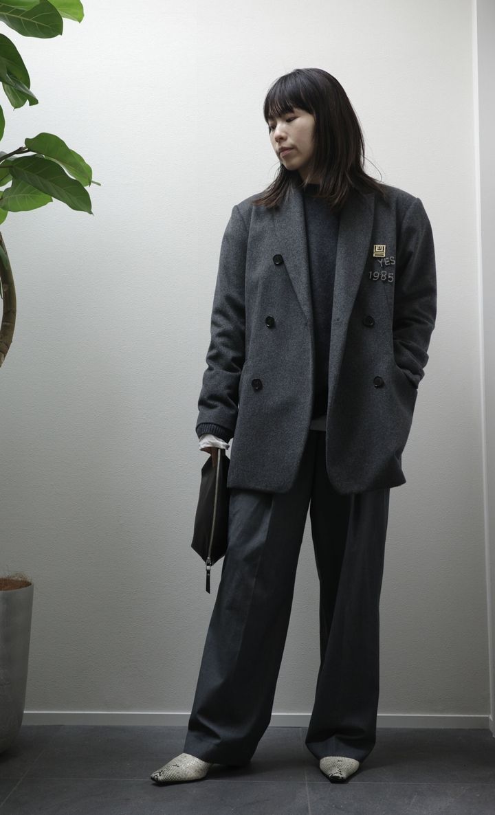 「スネーク柄のブーツがさり気なくポイントになるようにシンプルにまとめました。グレーのワントーンでシックにまとめながらも、ブローチ使いやレイヤードでスタイリングがぼんやりしないように意識しました。強過ぎない、サラリとしたコーディネートが好きです」