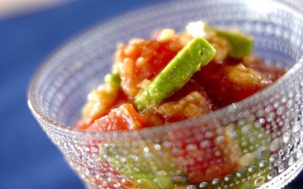 マグロとアボカドを特製ドレッシングで和えるサラダです。玉ネギを加えたドレッシングは、ほど良い辛みがアクセント。まろやかなアボカドによく合います。さっぱりした少し洋風の味わいなので、白ワインにぴったりですよ。