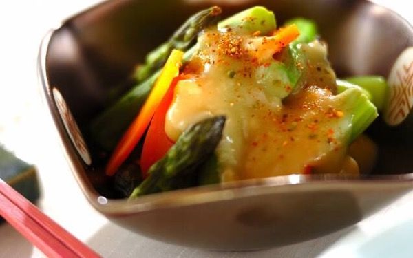 洋風野菜のアスパラに、酢みそをかけて和食に合う副菜に。酢みそは電子レンジで作れて便利です。この酢みそはどんな野菜にも合うため、冷蔵庫にある野菜でアレンジするのも◎。