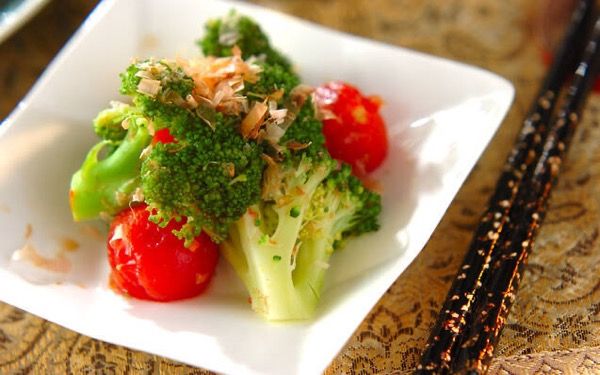 洋風素材のブロッコリーとプチトマトのおひたしです。プチトマトは湯むきすることで、味がよくなじみます。風味の強い野菜を使うので、味付けはしょうゆとかつお節のみ。緑と赤のビタミンカラーで、茶色くなりがちな和食の食卓を彩ります。