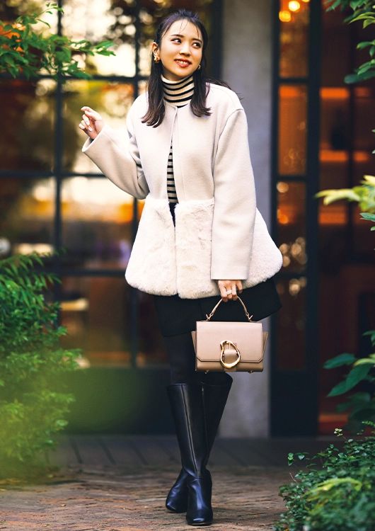 華やかさと抜け感を両立する甘モードなファー使いのディティールが自信が持てる装いに。