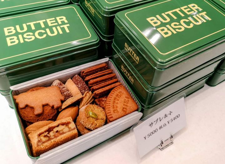 牛乳はもちろん、バターやチーズ、スイーツなどが並ぶお店。選んで楽しい開けてうれしい「オリジナルビスケット缶」。まず、缶のサイズ(小サイズ税込440円、中サイズ税込550円)を選び、好きなビスケットを自由に詰め合わせ。小サイズの缶は8〜10種類(目安約5,000円〜)、中サイズの缶は12〜15種類(目安1万円前後)入ります。