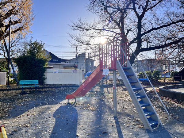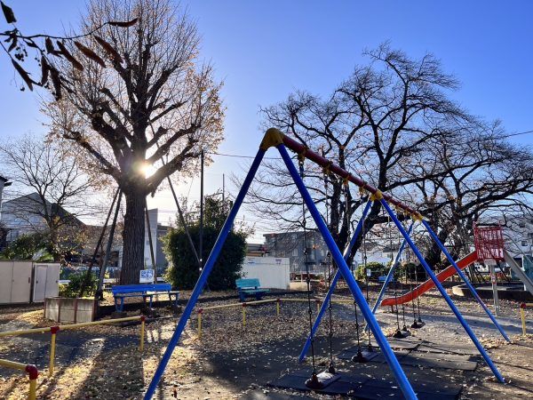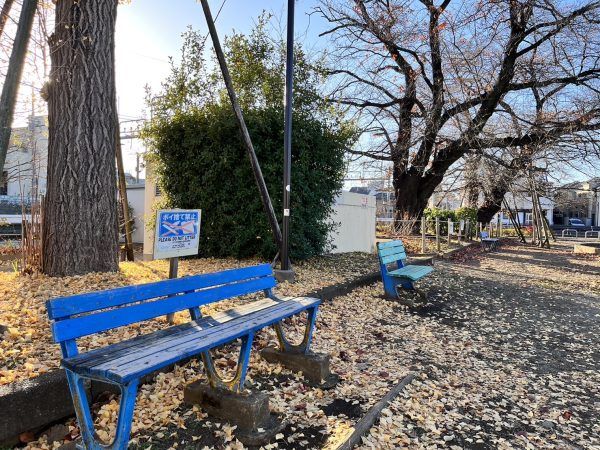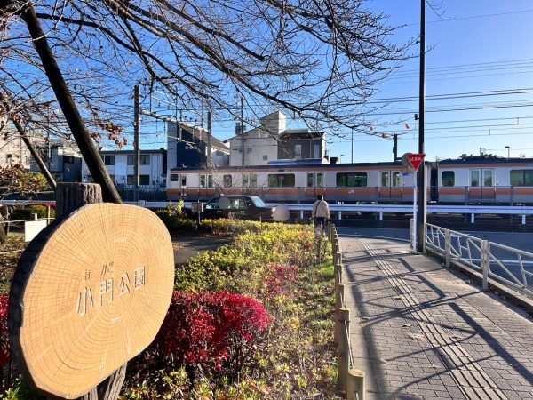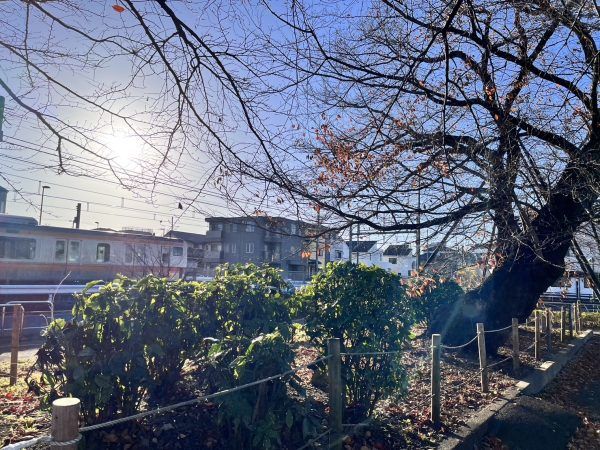 公園のすぐ横を中央線が走っているので、電車を見ながら遊ぶことができます。桜の木と一緒に写真を撮る事もできそうですね♪