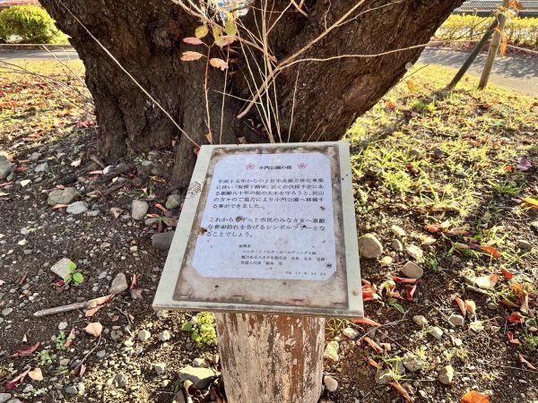 根本に設置されていたプレートには、平成17年(2005年)にこの木は樹齢80年と書かれています。今は2024年ですので、桜の木は100才くらいということですね!すごい!!