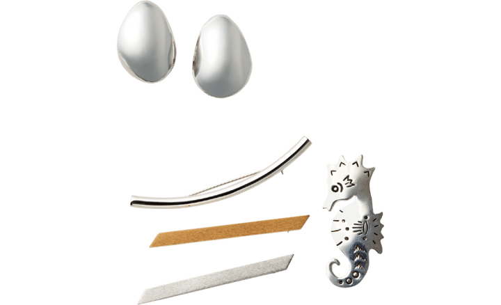 質感違いのシルバーに、ゴールドをひとつポイントでオンして。イヤリング〈シック ロック〉[合金×真鍮]¥12,100(イリスフォーセブン/フーブス)、タツノオトシゴブローチ[スターリングSV925]¥25,300(ハルポ/エスケーパーズオンライン)、ラインブローチ 上から:ブローチ[合金PTコーティング]¥15,400、[合金YGコーティング]¥14,300、[合金PTコーティング]¥14,300(全てジュエッテ)