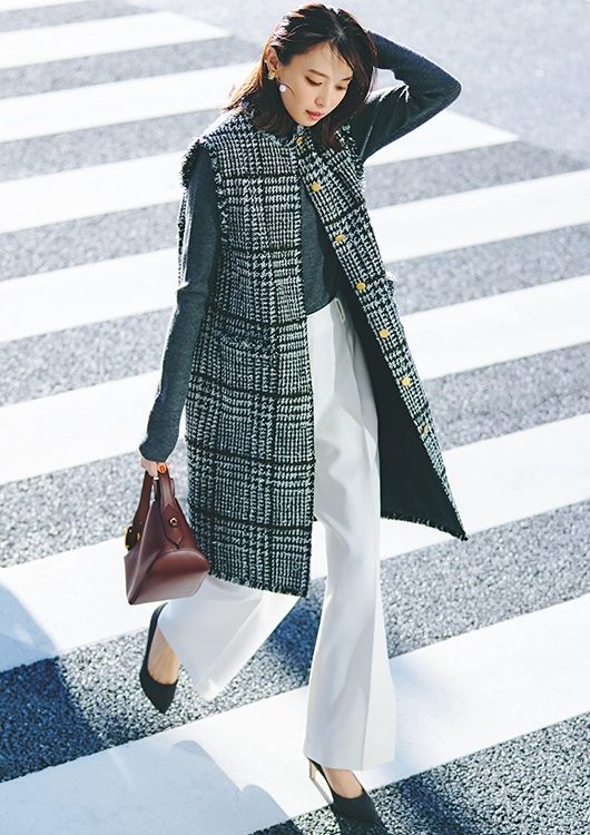 ツイードジレ¥33,000、パンツ¥13,000/ともにPLST ニット¥7,920/ミラ オーウェン ルミネ新宿2店 イヤリング¥2,640/アネモネ(サンポークリエイト) イヤカフ¥9,900/ステラハリウッド バッグ¥148,500/J&Mデヴィッドソン パンプス¥15,400/ダイアナ(ダイアナ 銀座本店)