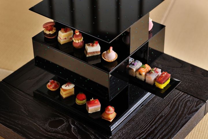 古くから濃茶の菓⼦器には、縁⾼(ふちだか)のお重が使われてきたこともあり、このアフタヌーンティーでは、⽟⾍細⼯を施したオリジナルの重箱を使用。漆塗りのお重には、1mm四⽅にカットされた⽟⾍の⽻が散りばめられ、その輝きは⽬を奪われるほど。