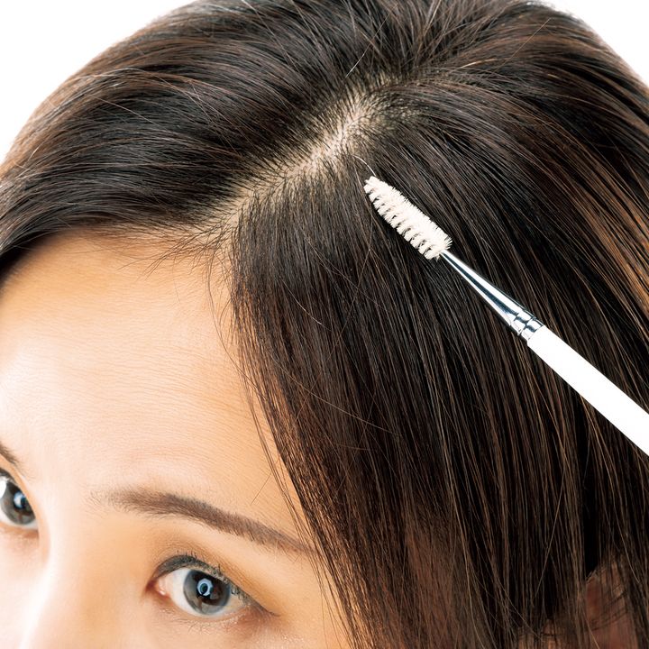 ドライ系ワックスをスクリューブラシにとり手の甲でなじませ、押さえつけて塗布したら浮きやすい白髪も安心!アイブロウブラシにスプレーをシューッとして代用も可能。ベタつくバームは×。