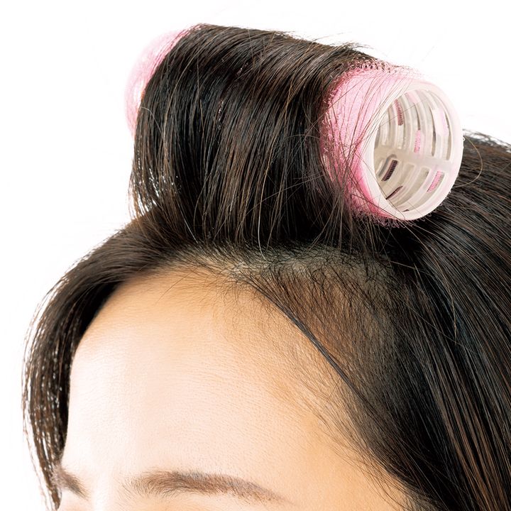 分け目を目立たせないように根元から立ち上がりをつけて、伸びてきた白髪を見えにくく。分け目をつぶすようにマジックカーラーを巻くと、ふんわり立ち上がり白髪も薄毛も一気にカバー。