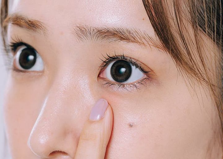 目まわりの血流が滞ることで現れる青クマは、ベージュだけだとグレーににごって見えがち。血色を補い、青みを打ち消すオレンジを塗ってから、ベージュを重ねるとうまく隠れる。
